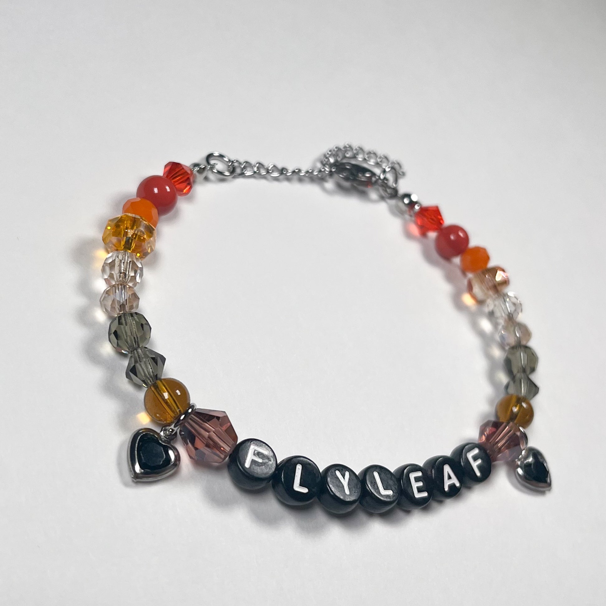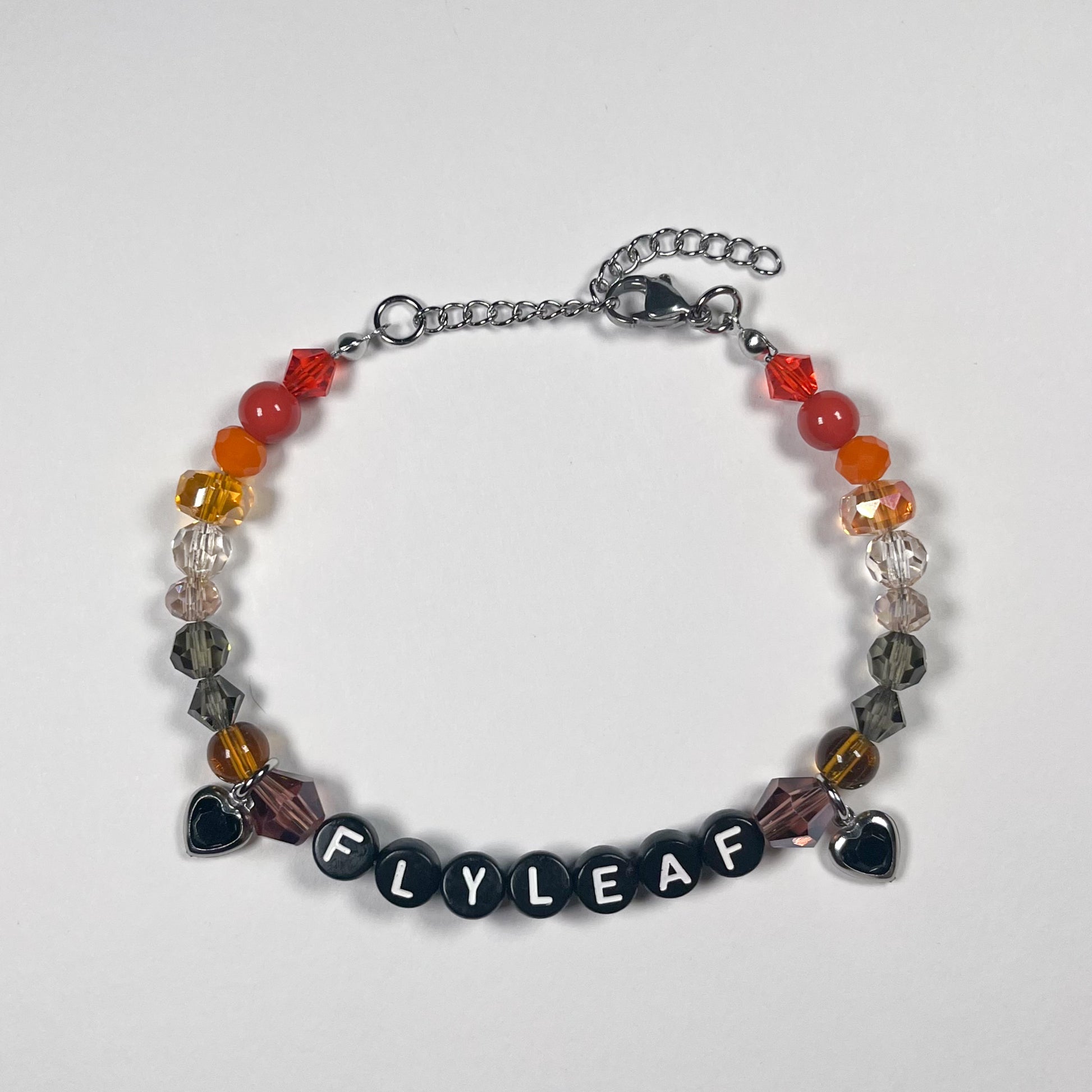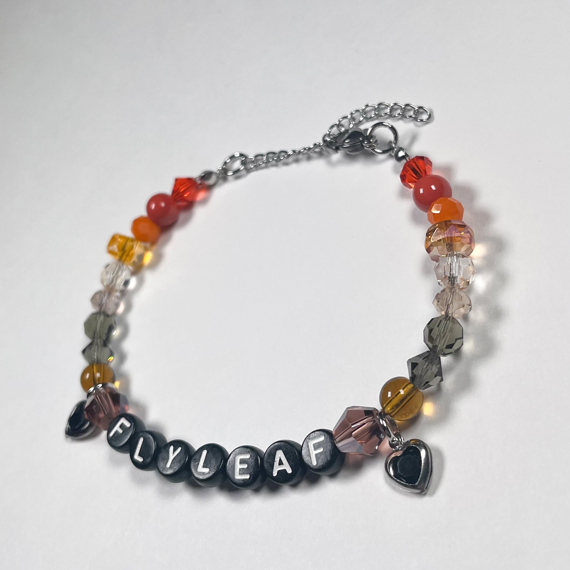 Made with: glass beads, glass heart with stainless steel boarder, and plastic letter beads on a stainless steel wire with a 4cm stainless steel adjustable chain.