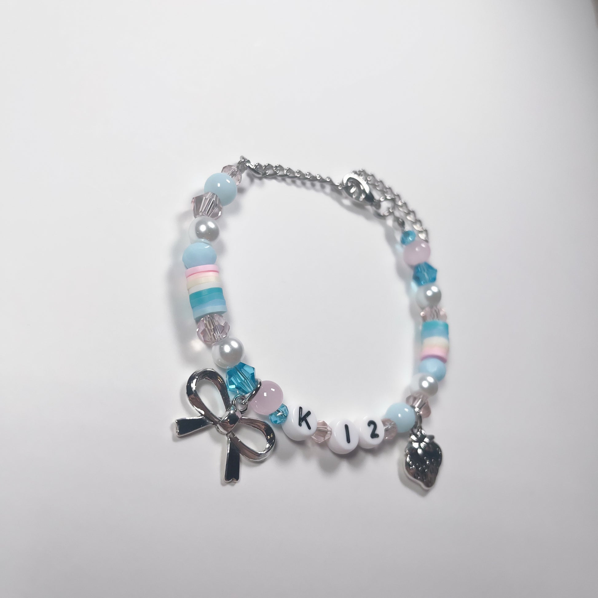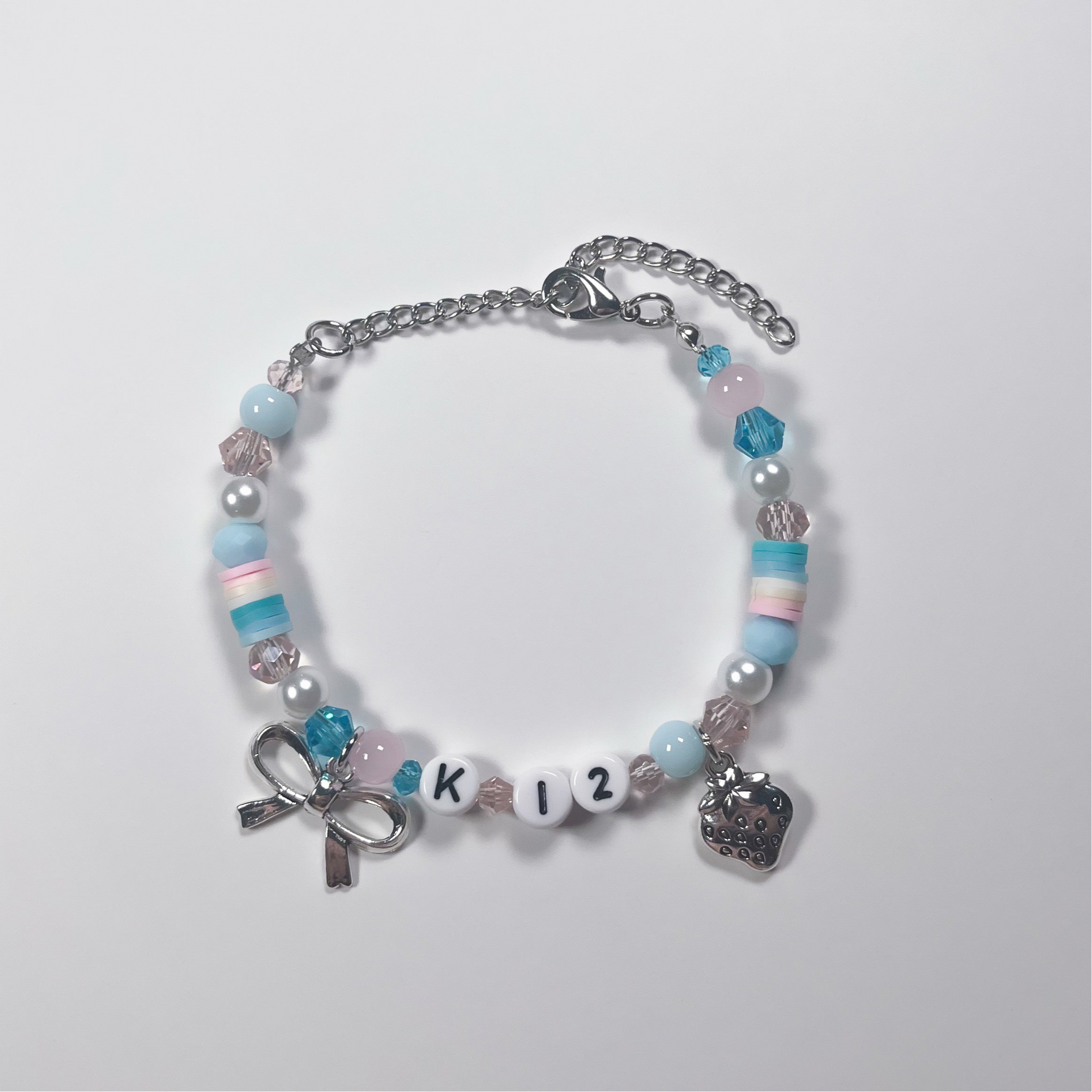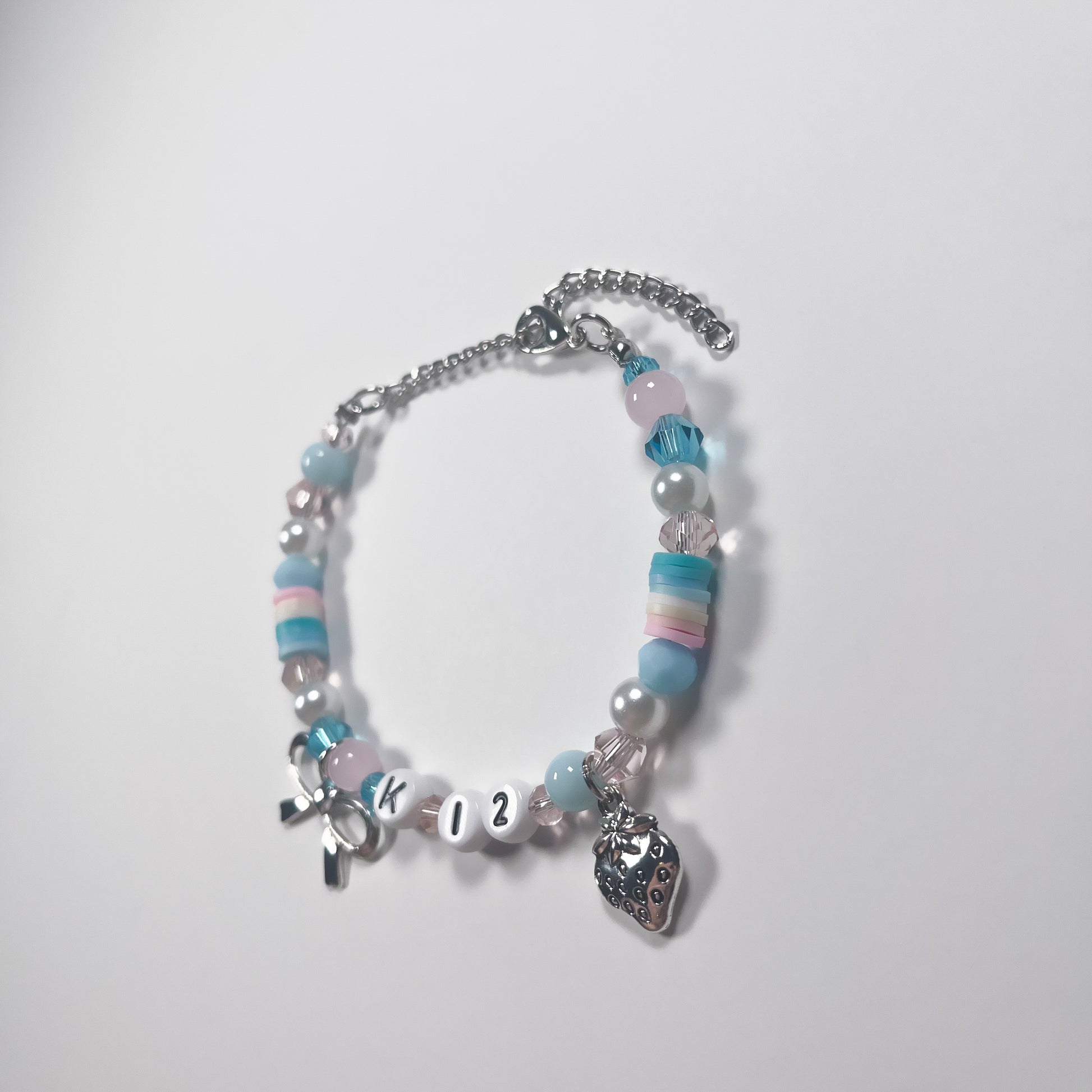 Made with: glass beads, plastic letter beads, and zinc alloy charms on a stainless steel wire with a stainless steel adjustable chain.