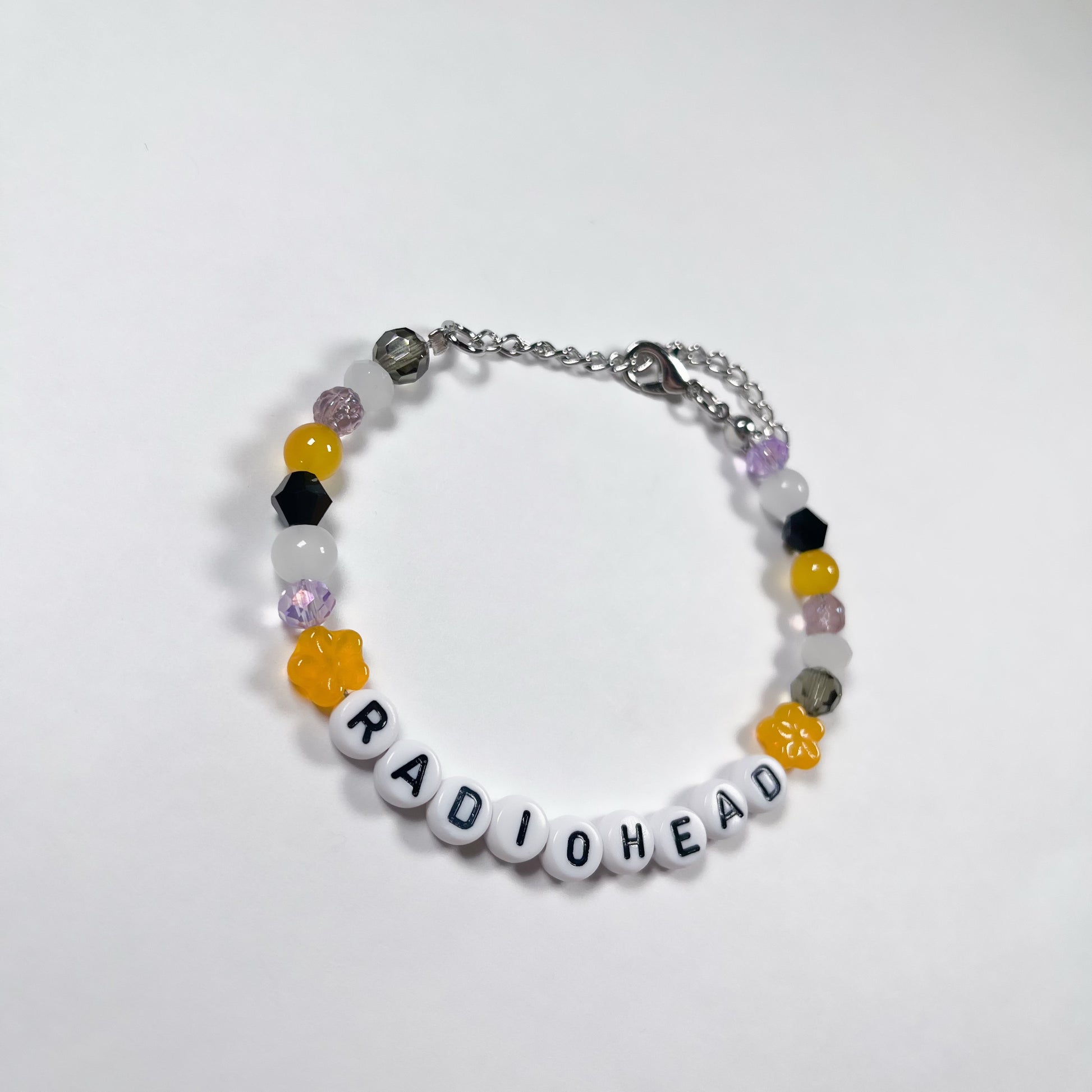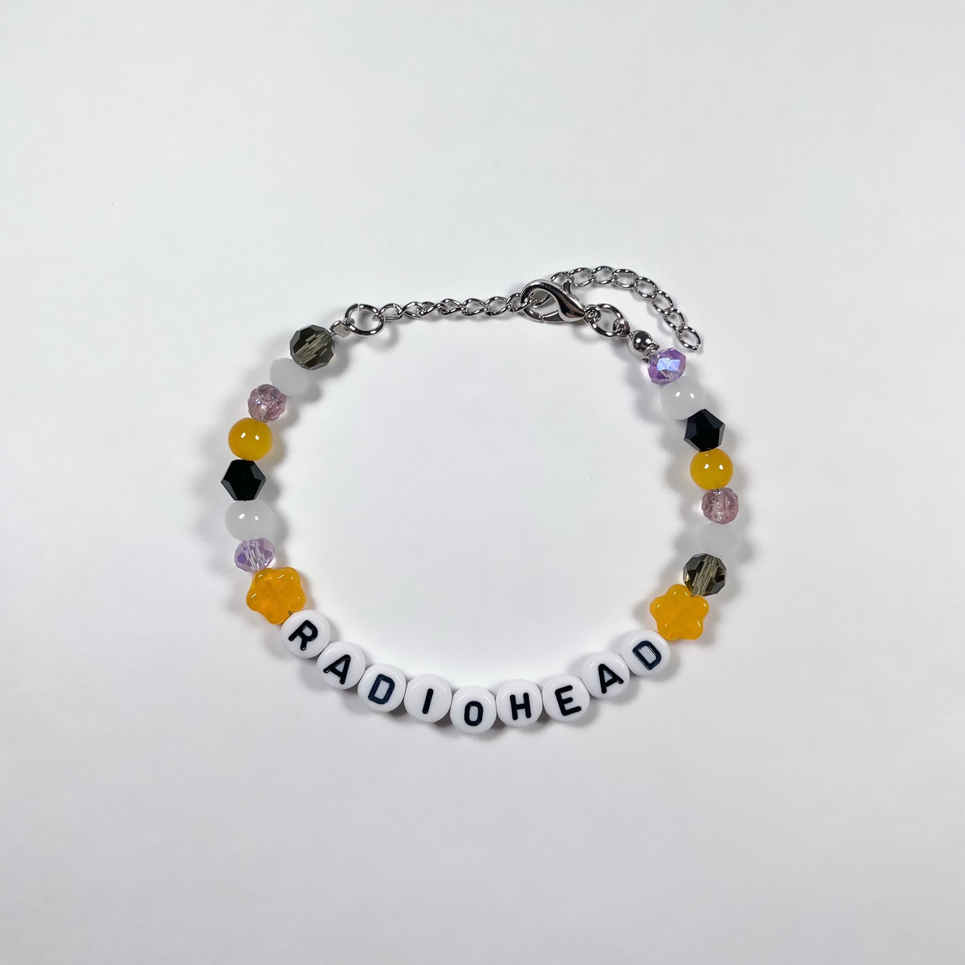 Made with: glass beads, and plastic letter beads on a stainless steel wire with a 4cm stainless steel adjustable chain.
