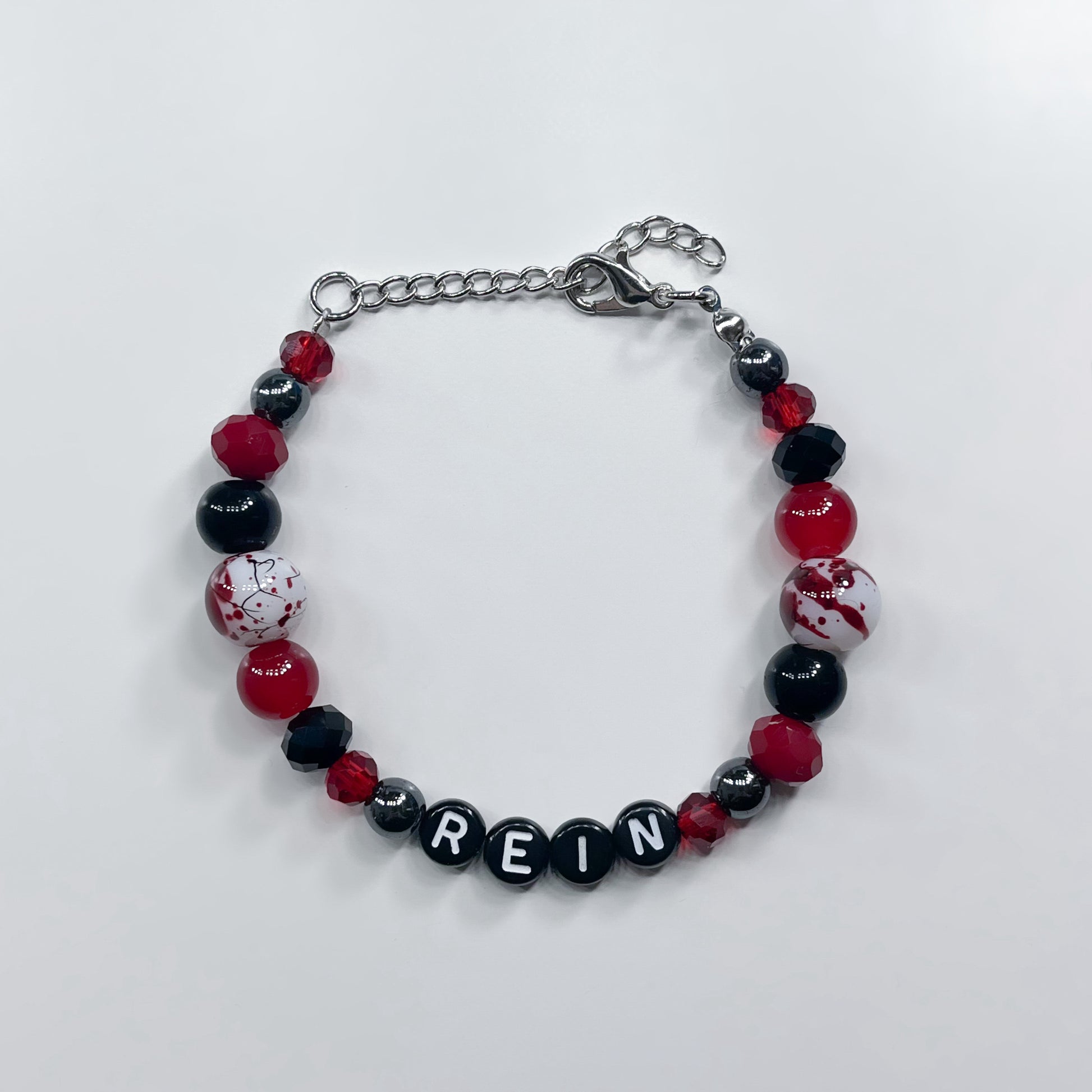 Made with: plastic letters and glass beads on a stainless steel wire with a 4cm stainless steel adjustable chain.